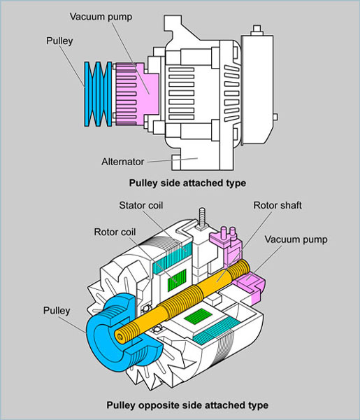 These types of alternators are divided into two types: One has the vacuum pump on the pulley side (front mount) while the other has the vacuum pump at the opposite side end to the pulley (rear mount).