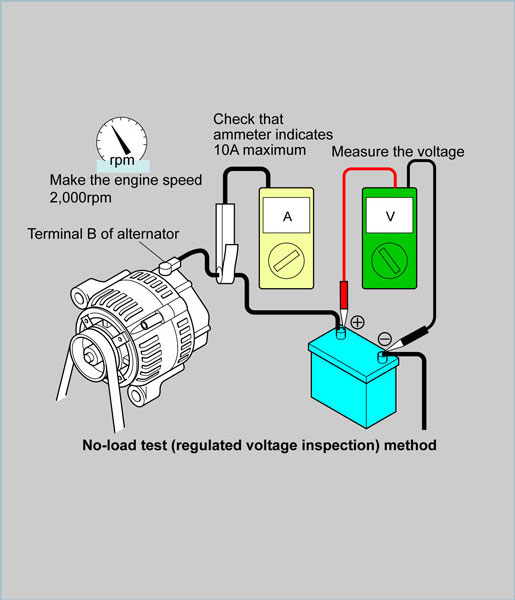 With an IC regulator type alternator, the specified value of the regulated voltage is between approx. 13.5V and 15.1V (with the engine speed at 2,000 rpm).