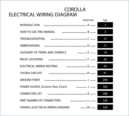 Each EWD is divided into a number of sections, or chapters, as shown in the diagram on the left. Sections A through E provide general advice and information common to all Toyota and Lexus models while the remaining sections (F through M) cover the specific detail pertaining to the cover model.
