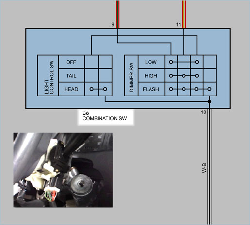 The description "C8" identifies the connector code and the particular part is also identified by name e.g. "COMBINATION SW".
