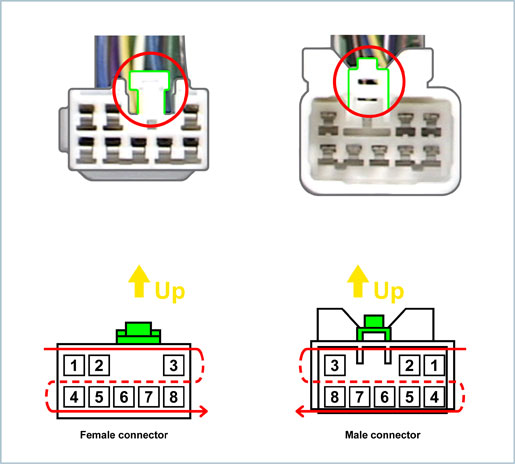 The numbers are read from the upper left to the lower right for female connectors and from the upper right to the lower left for the male connector (mirror image of the female connector) as shown in the illustration.