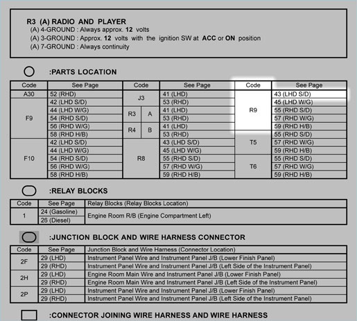 Turn to the system circuit information page. The connector code for the "REAR DOOR SPEAKER RH" is R9. The item under "PARTS LOCATION" refers us to page 43 for R9 (LHD S/D).