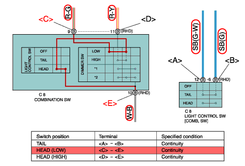 Turning the light control switch to HEAD (LOW) position will allow current to flow between terminal C and terminal E, and the headlights (LOW) will come on.