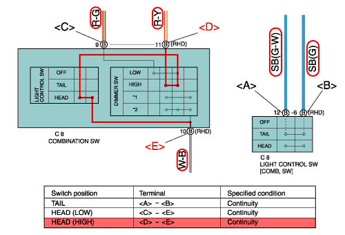 Turning light control switch to HEAD (HIGH) position will allow current to flow between terminal D and terminal E, and the headlights (HIGH) will come on.