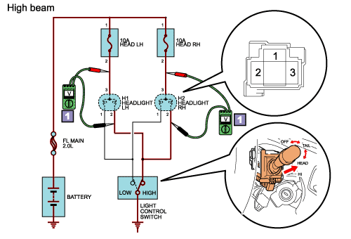 Check the voltage by connecting the tester leads to the headlight connector of the vehicle side (back probe).