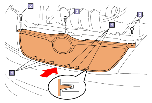 Locate the front bumper cover with the mounting points and engage the clips and claws, then align and install the bolts and screws. Then repeat the process for the radiator grille.