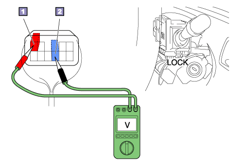 With the ignition switch in the LOCK position, measure the voltage change between the radio receiver assembly connector terminal E and terminal F.