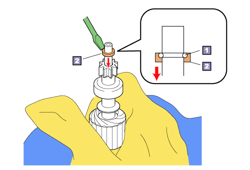 Remove the starter armature assembly from the starter yoke and hold the armature in a vise wedged between aluminium plates or a cloth.