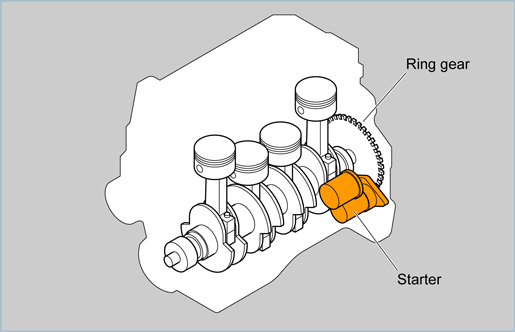 The starter is required to generate extremely large torque from the limited power available from the battery and should be compact and light-weight as well. For this reason, a DC (direct current) series motor* is used for the starter motor.