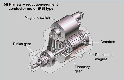 The Planetary reduction-segment conductor motor (PS) type starter uses permanent magnets in place of the field coils. |