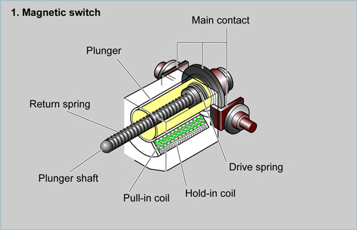 The magnetic switch operates as the main switch for the current flowing to the motor and controls the engagement and disengagement of the pinion gear.