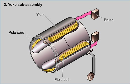 | The yoke sub-assembly produces the magnetic field required for the motor to operate. It also works as an outer case of the field coils, the pole core and a passage for the lines of magnetic force. The field coils are connected to the armature coil in series |