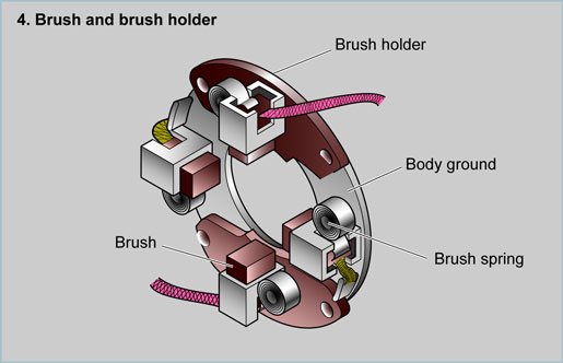The brushes are pressed against the armature commutator by the brush springs, allowing the current to flow from the coil to the armature in a fixed direction. The brushes are made of copper-carbon, which has excellent conductivity and abrasion resistance characteristics. The brush springs maintain the brushes in contact with the armature commutator and assist in stopping the armature revolving after the engine starts due to the frictional resistance of the brushes.