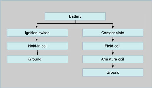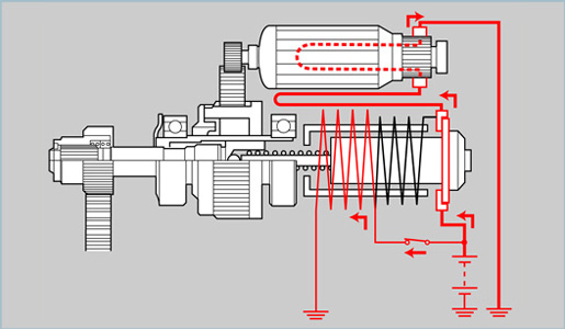 When the main contacts engage, current no longer flows through the pull-in coil, and the field coil and the armature coil receive current directly from the battery. The armature then starts to revolve at high-speed, and the engine cranks. At this time, the plunger is only held in position by the magnetic force exerted by the hold-in coil because no current is flowing through the pull-in coil.