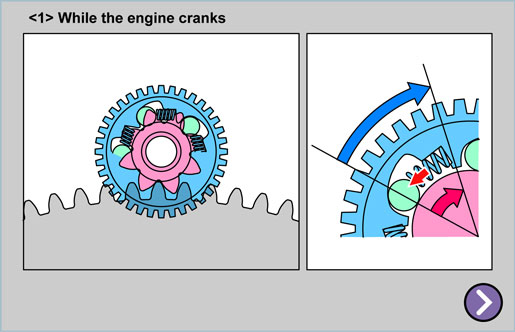 | When the clutch gear (outer) revolves faster than the spline shaft (inner), the clutch rollers are forced into the narrower section of the clutch gear, allowing the revolving force of the clutch gear to be transmitted to the spline shaft. |