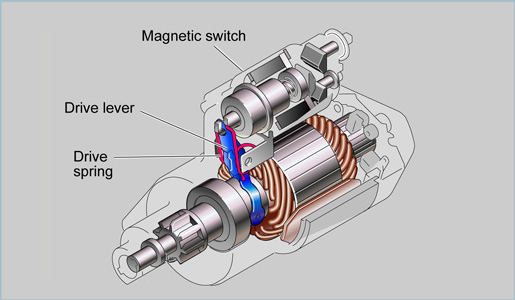 | The drive spring is built into the drive lever or into the magnetic switch. The drive spring of a conventional type starter operates in the same way as the return spring of a reduction type starter. |