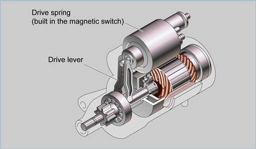 | The drive spring is built into the magnetic switch. The drive spring operates in a similar way in the reduction type and the conventional type starters. |