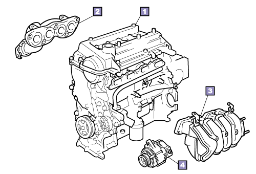 An engine with the auxiliary components and intake and exhaust manifold removed.