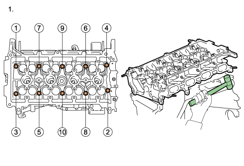 Loosen and remove the cylinder head mounting bolts in the specified order from outside to inside.
