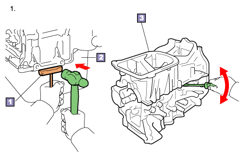 Turn the engine over. Using a flat-head screwdriver, remove oil pan No.1 by prying between the cylinder block and oil pan No.1.