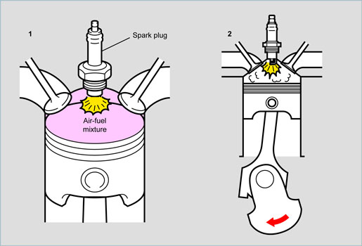 The gasoline engine converts the combustion of the air-fuel mixture to motive force.