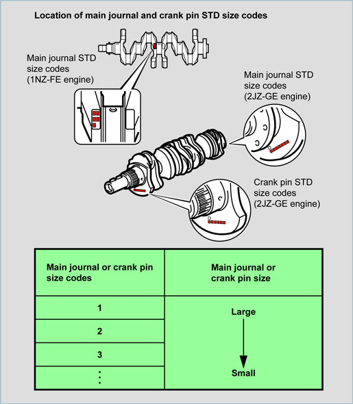 Differences in the main journal and crank pin circumference occur from unevenness in manufacturing precision. For that reason, there are several standard sizes for the main journal and crank pin.
