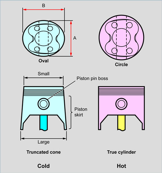 The construction of the piston is designed to maintain the proper clearance when the piston expands due to high temperatures during combustion.