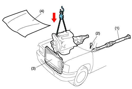 When installing the engine from the top, tilt and turn the engine while installing it in a manner such that it will not interfere with the vehicle body.