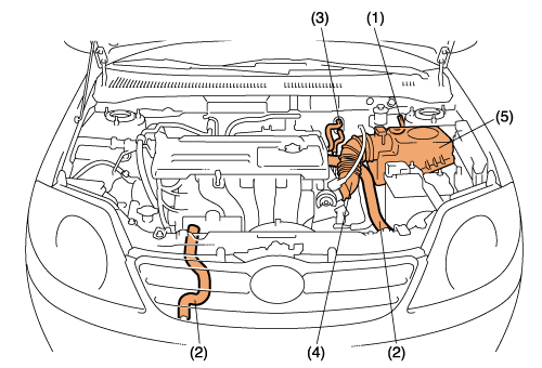 The coolant hose, the vacuum hose, and other hoses are connected to the engine.